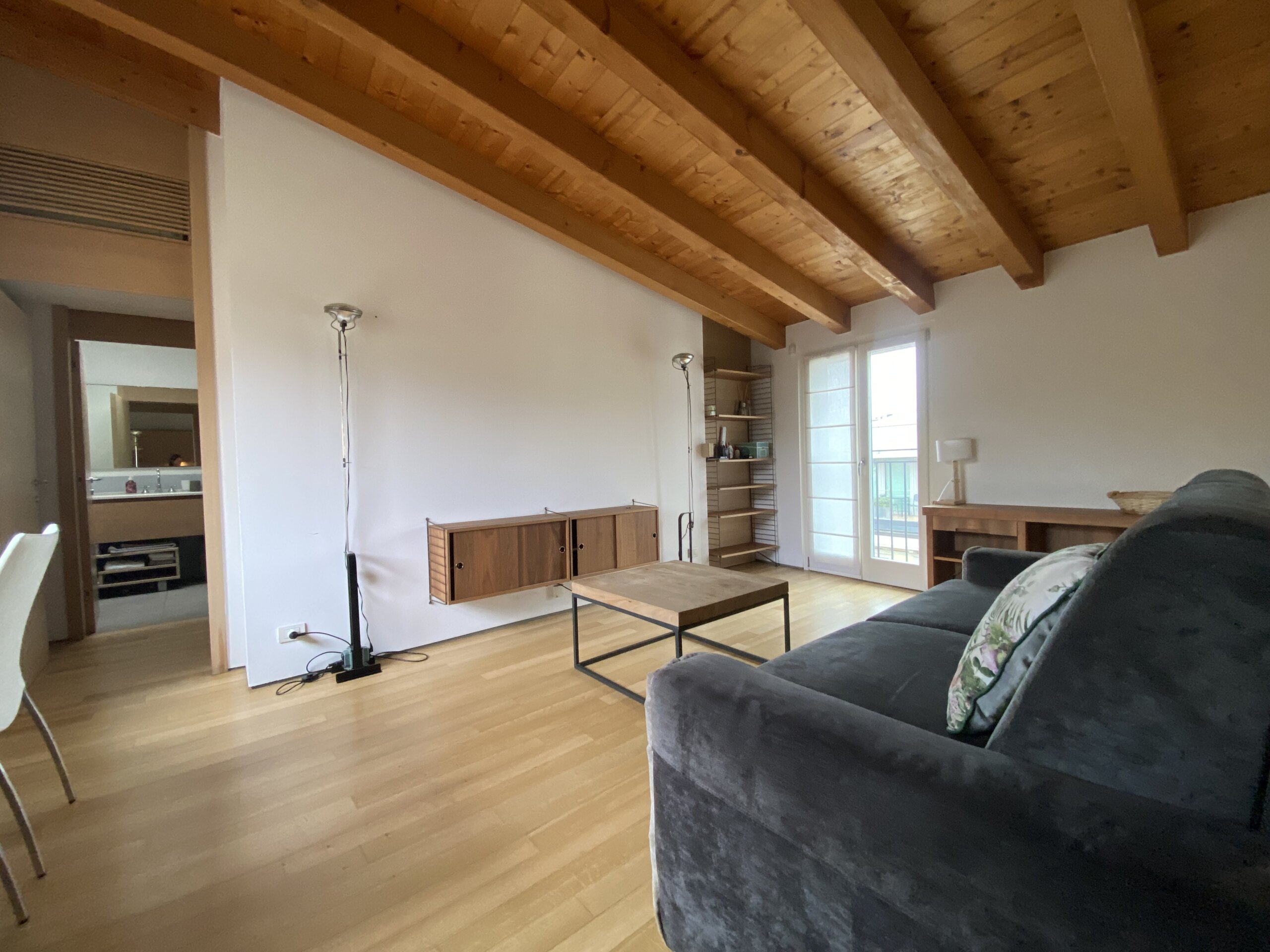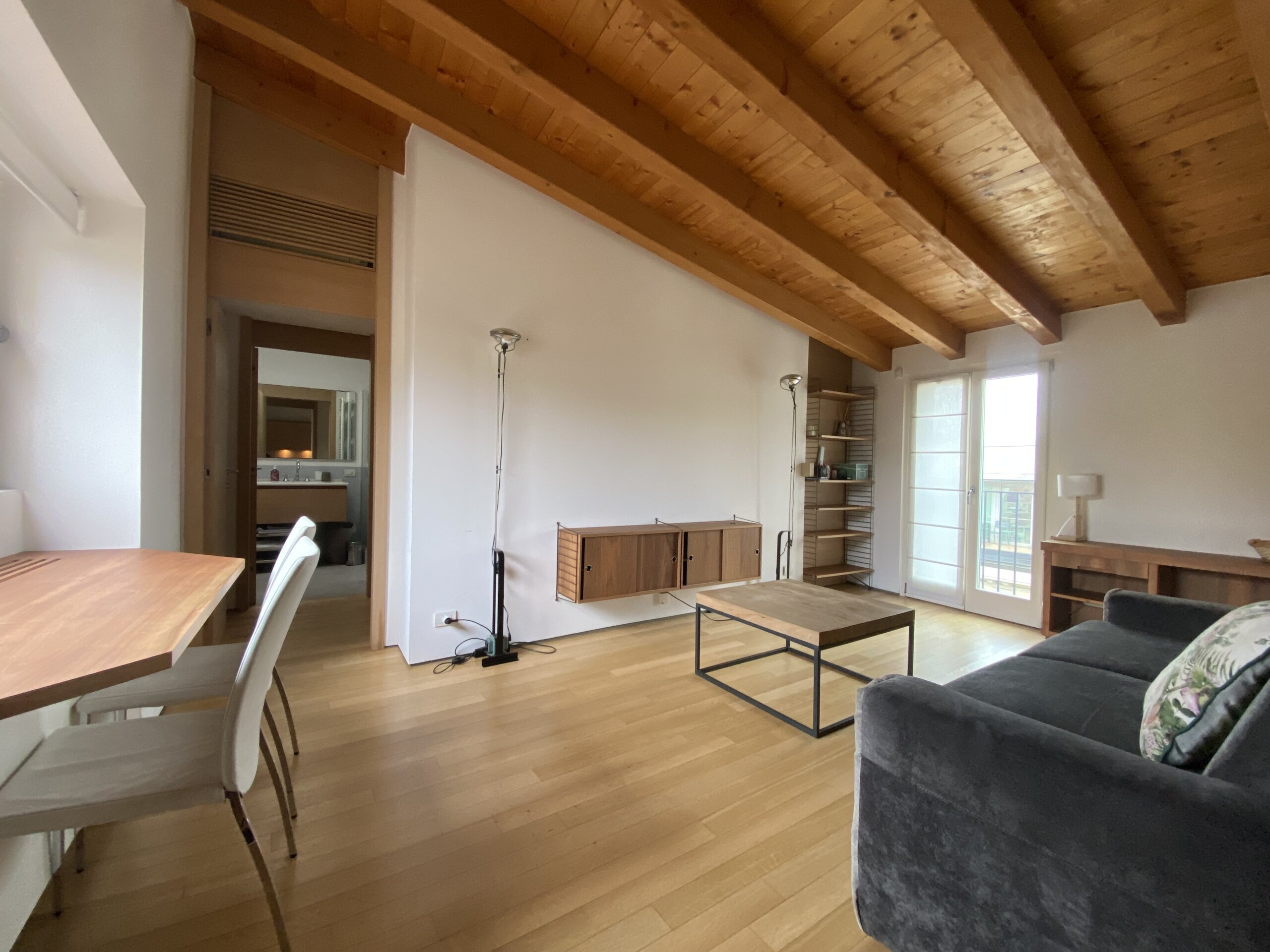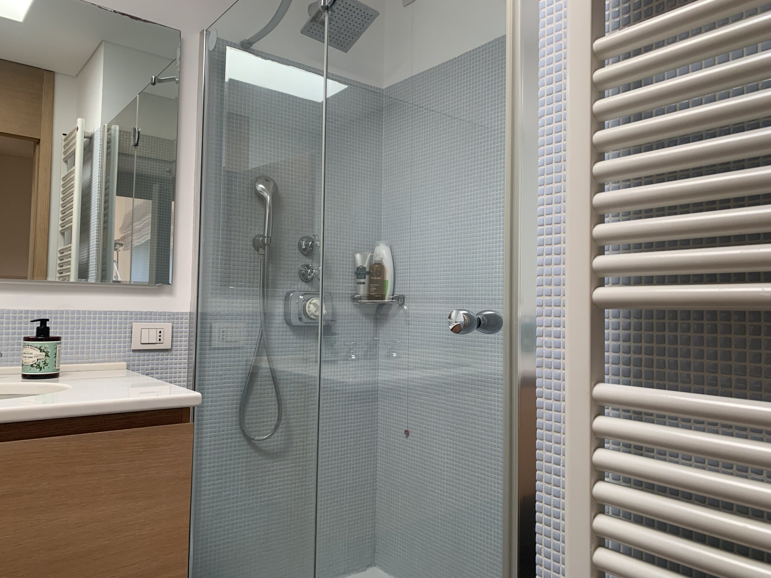 The apartment of about 60 sqm is located on the 6th floor with an elevator that goes up to the 5th floor + a small flight of stairs. It consists of a large living room with a fully equipped open kitchen, two bathrooms, one with a shower and the other for guests, and a double bedroom with large closets.