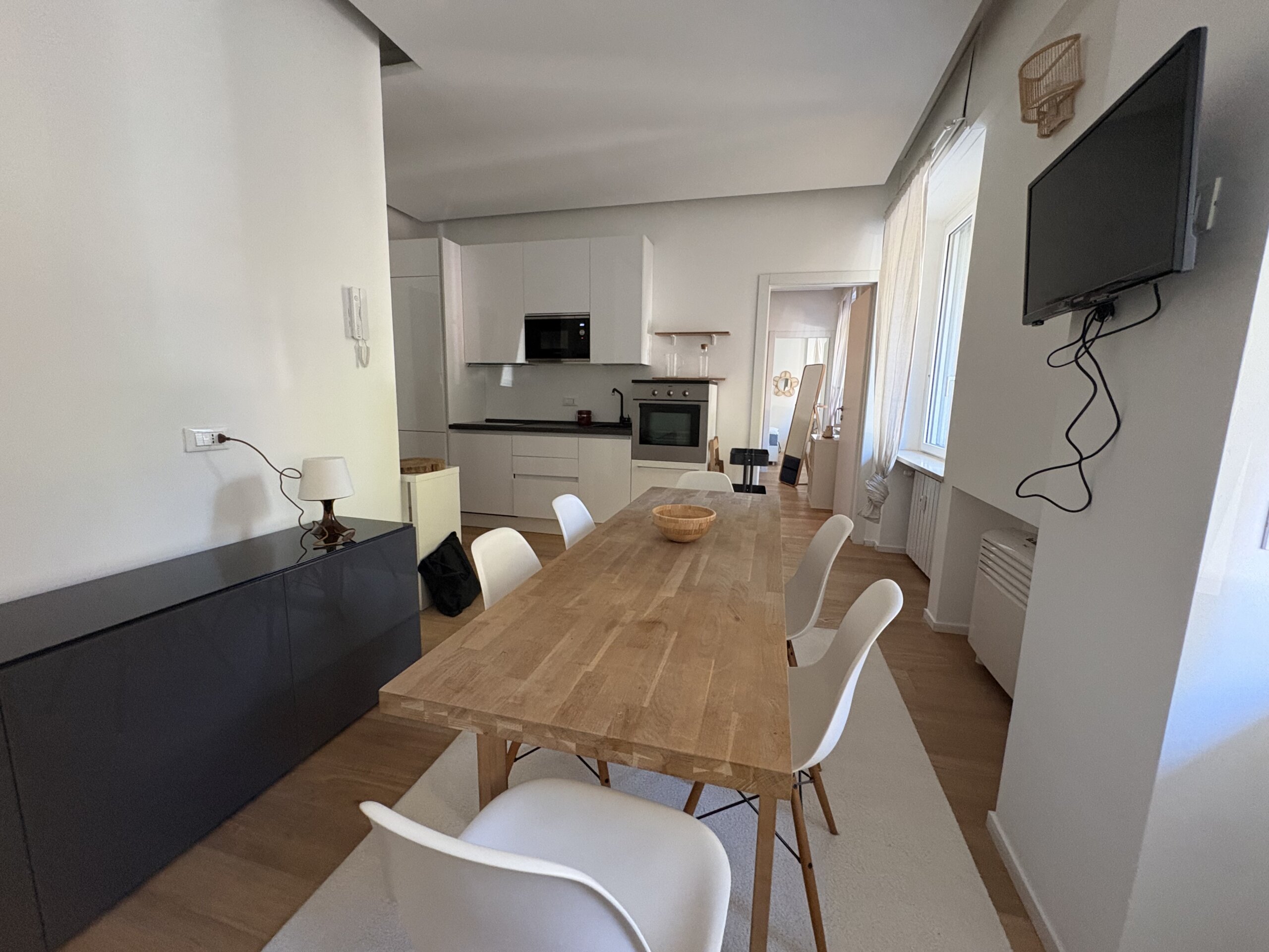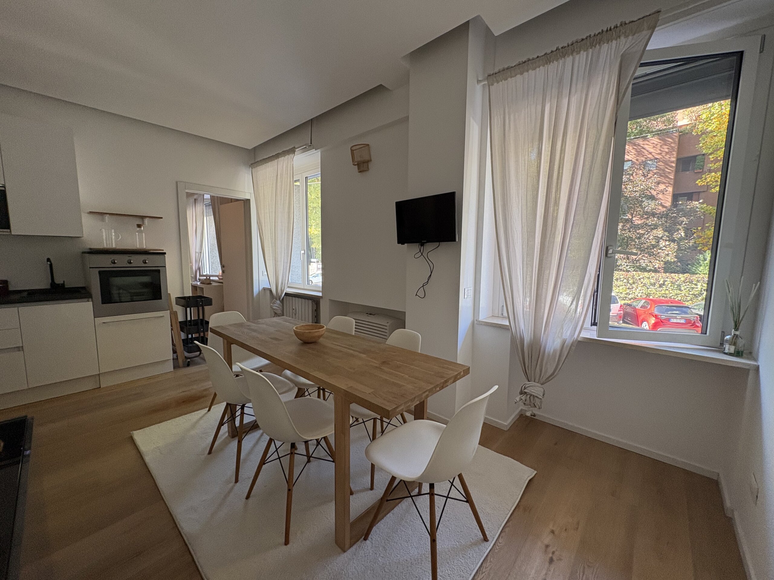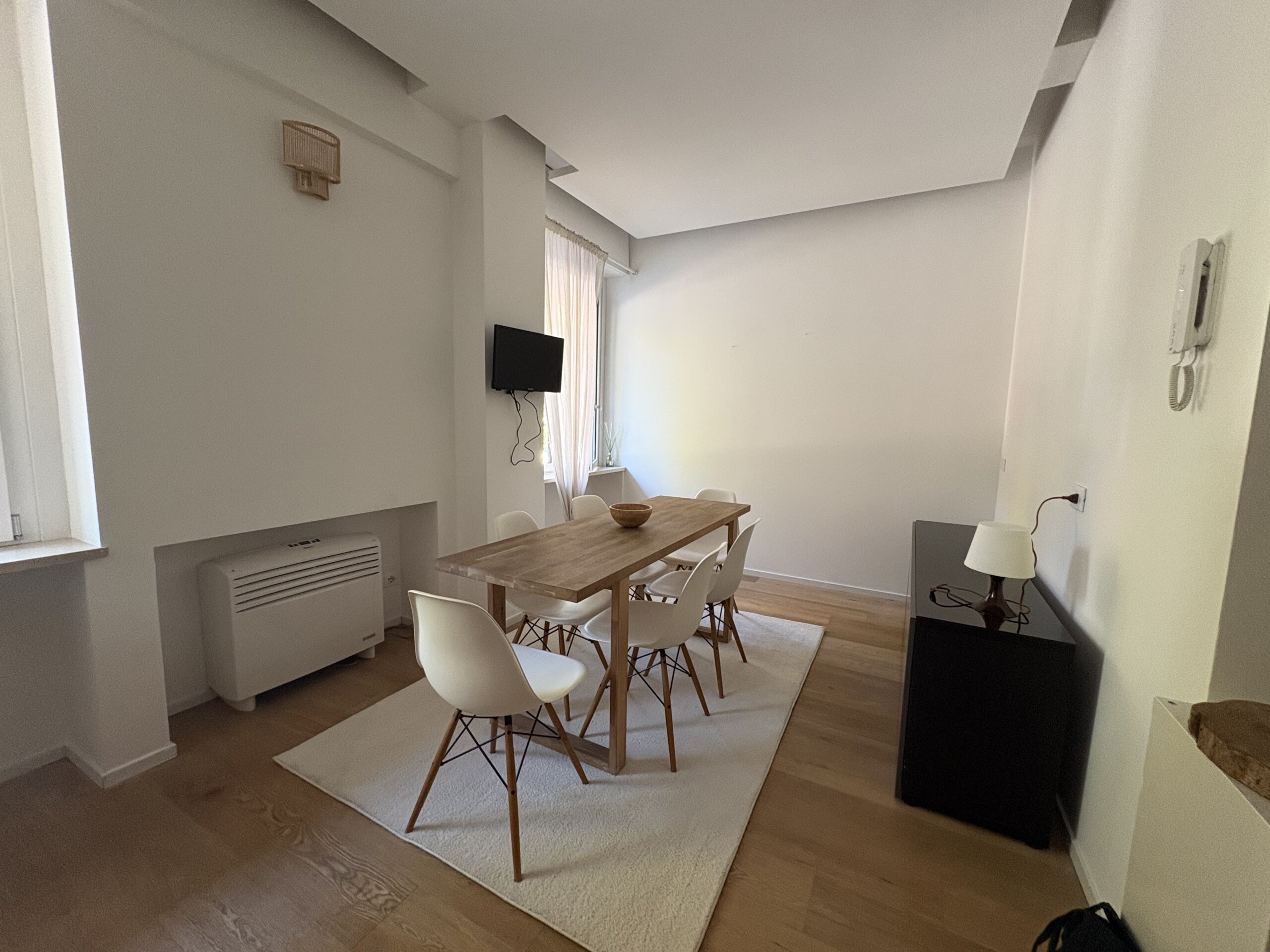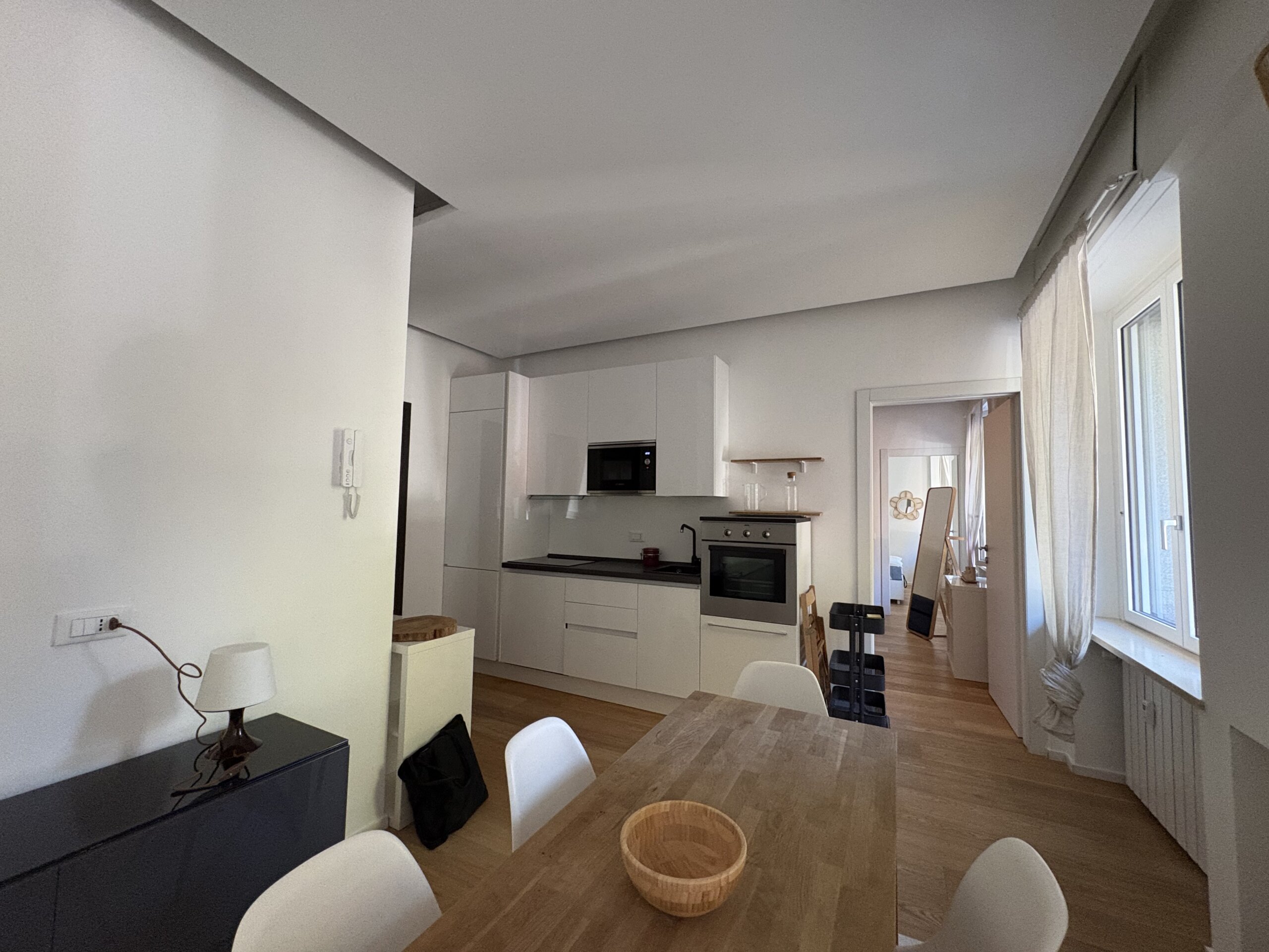 Bright and spacious newly renovated two-room flat located in the Porta Romana area. With a commercial area of 60 m², the flat on the mezzanine floor offers a welcoming environment. The flat consists of a double bedroom, a living room that can be converted into a second bedroom with a double sofa bed, a large open-plan kitchen area with a large dining table, ideal for dinners with friends and smart working, and two bathrooms with showers.