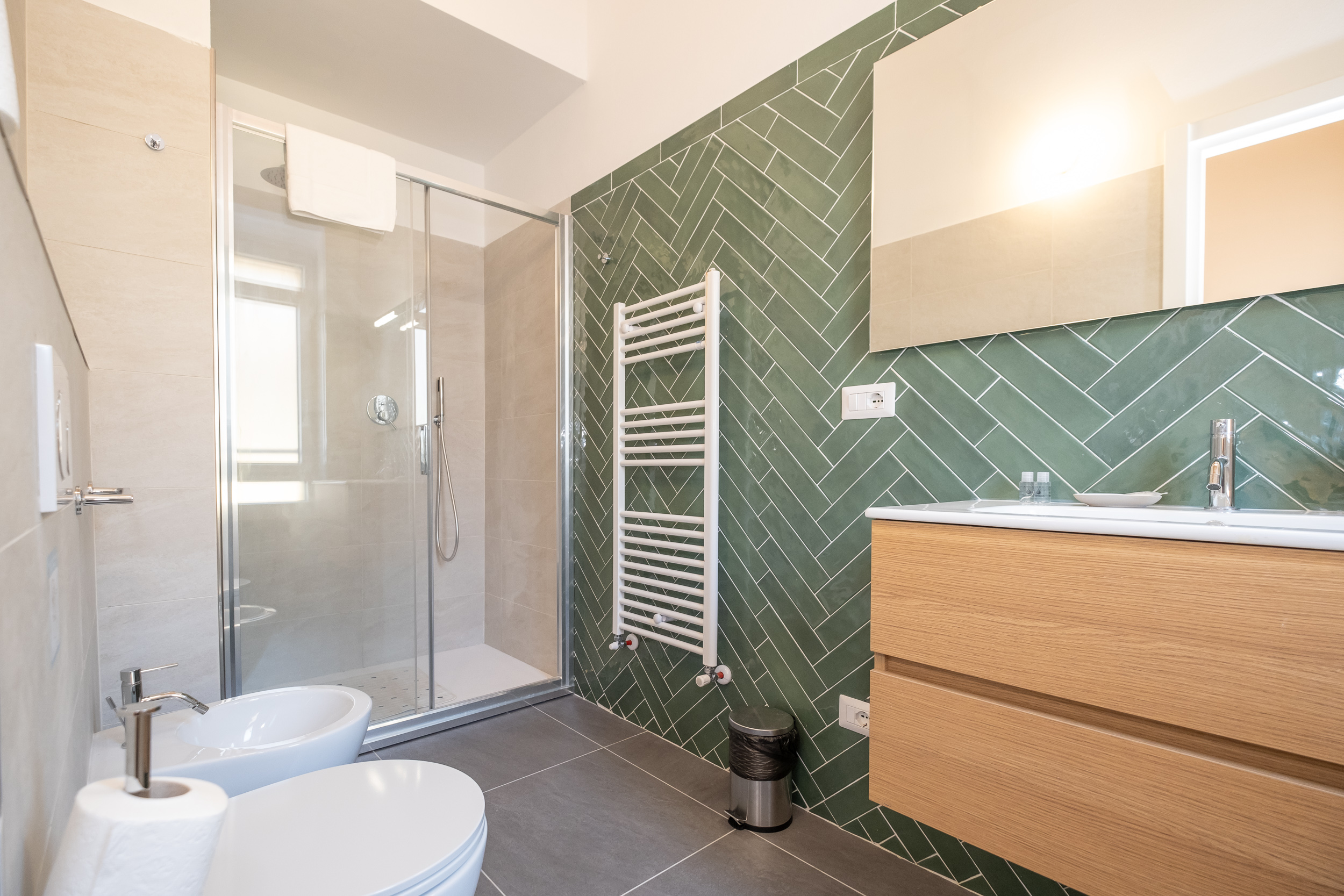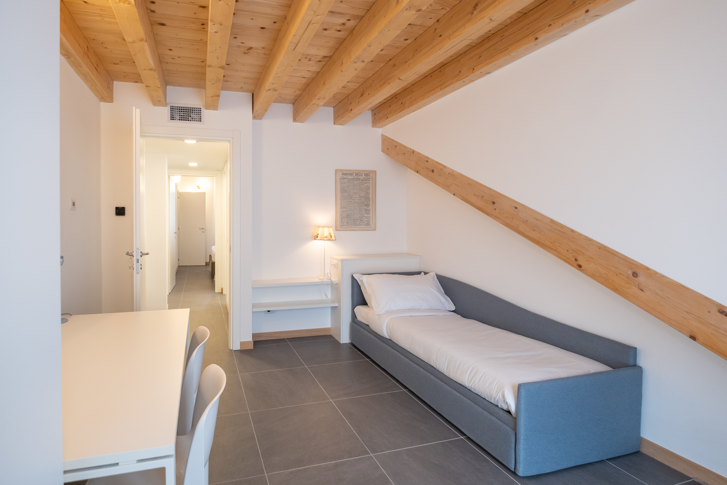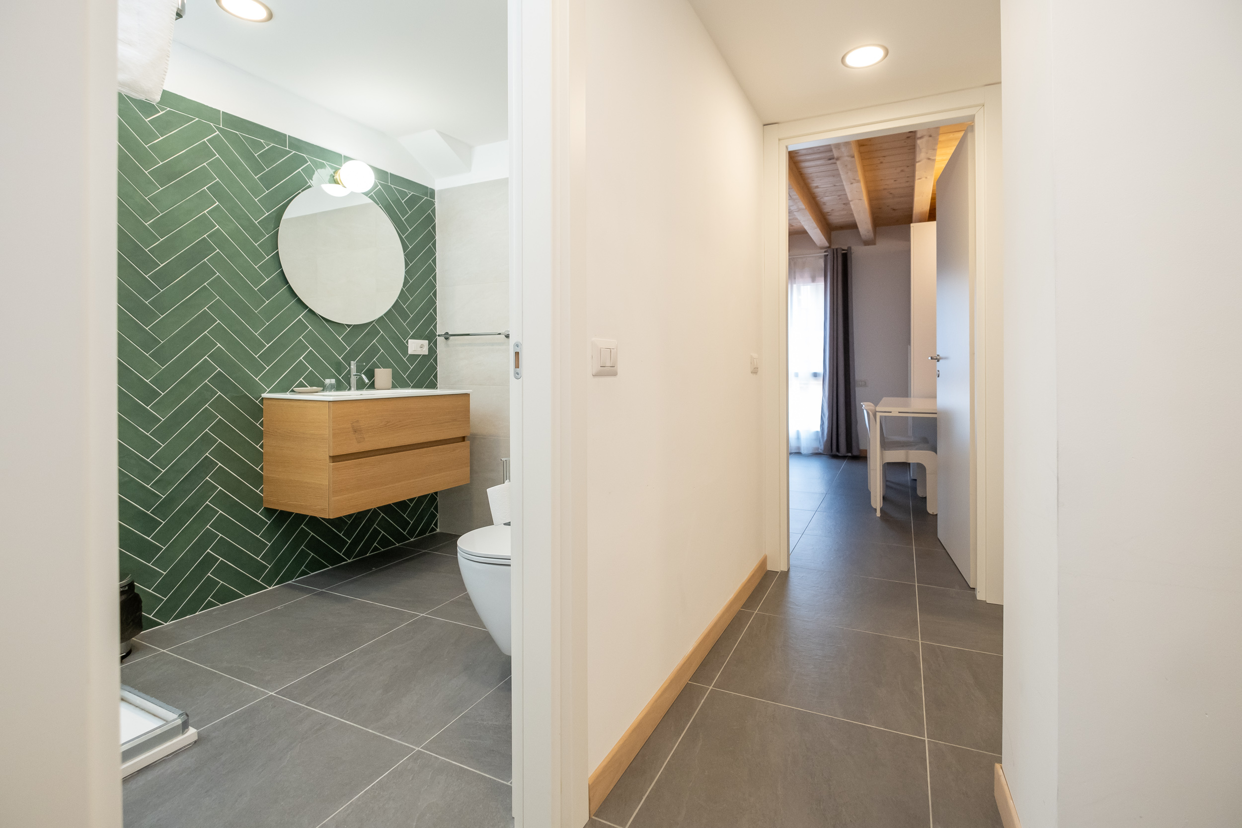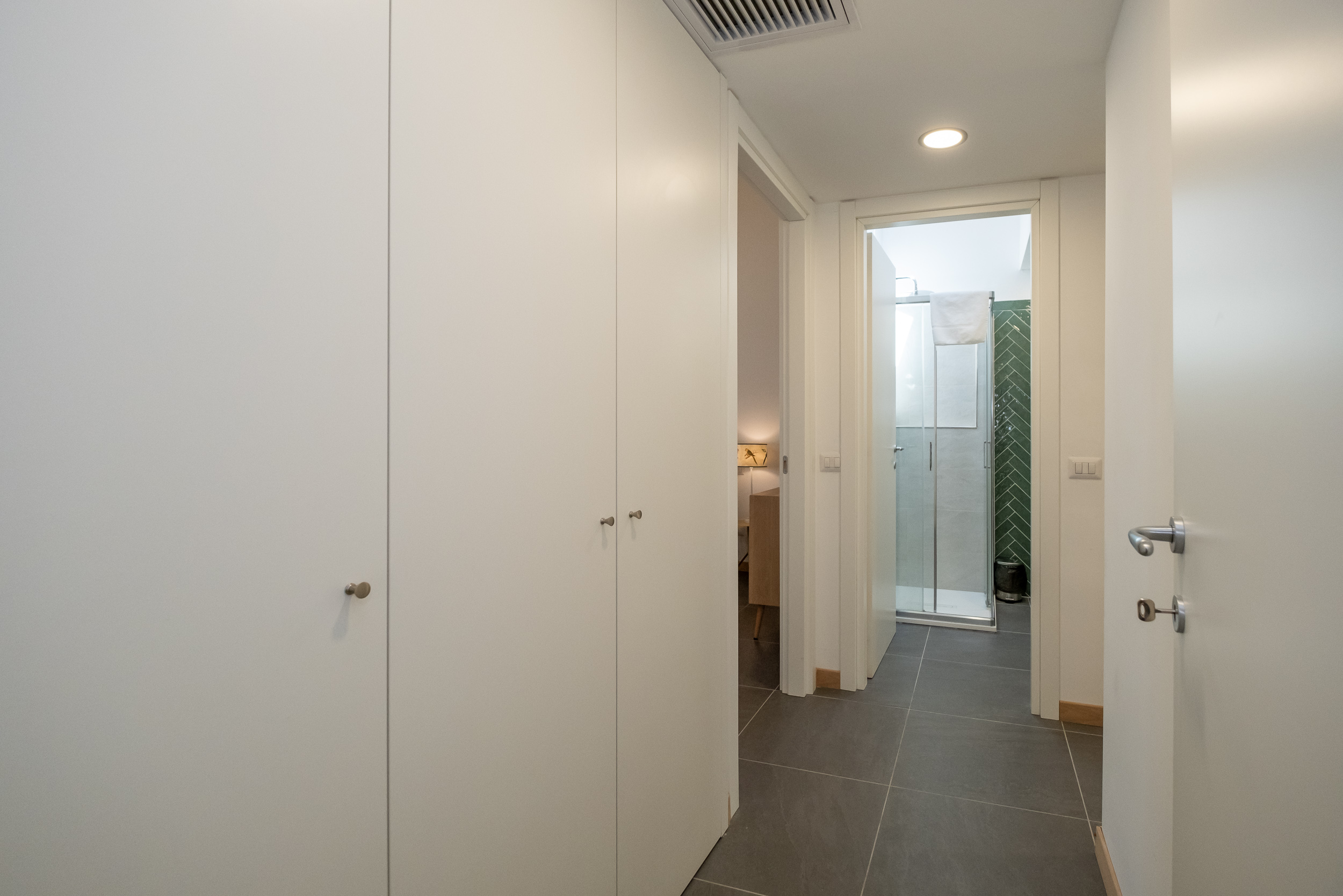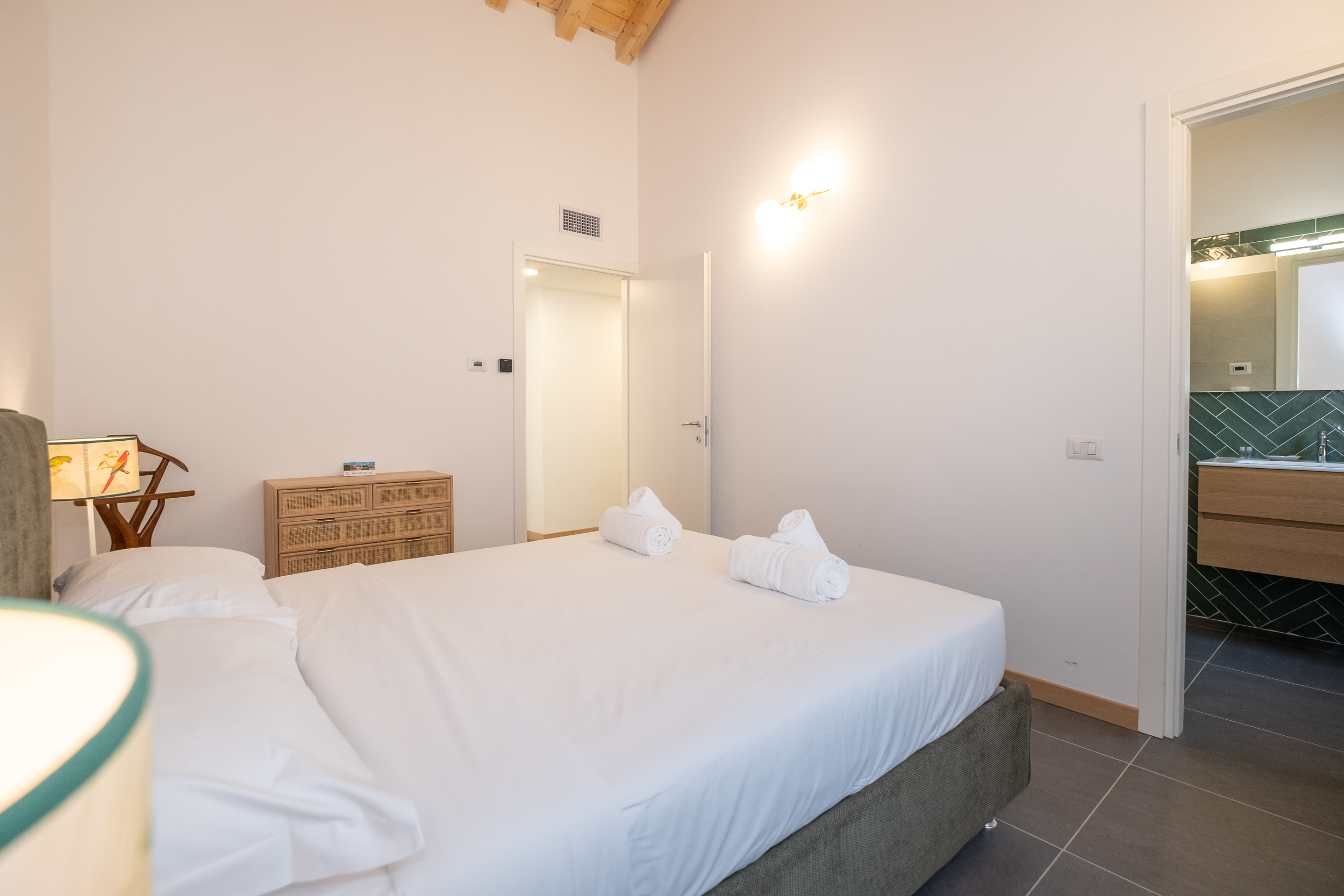 Una camera matrimoniale con bagno privato con doccia, un’altra camera con letto singolo che diventa matrimoniale ed una scrivani e fuori nel corridoio un bagno anch’esso con doccia.