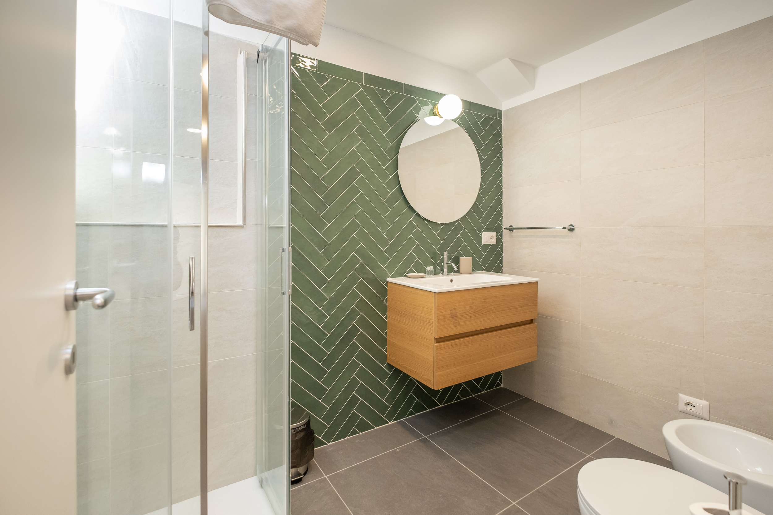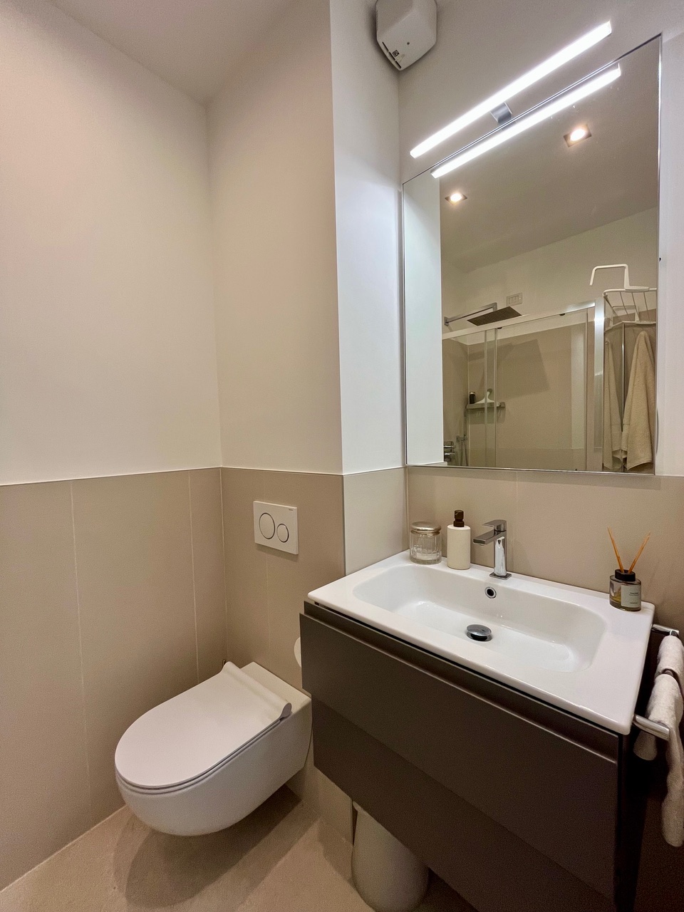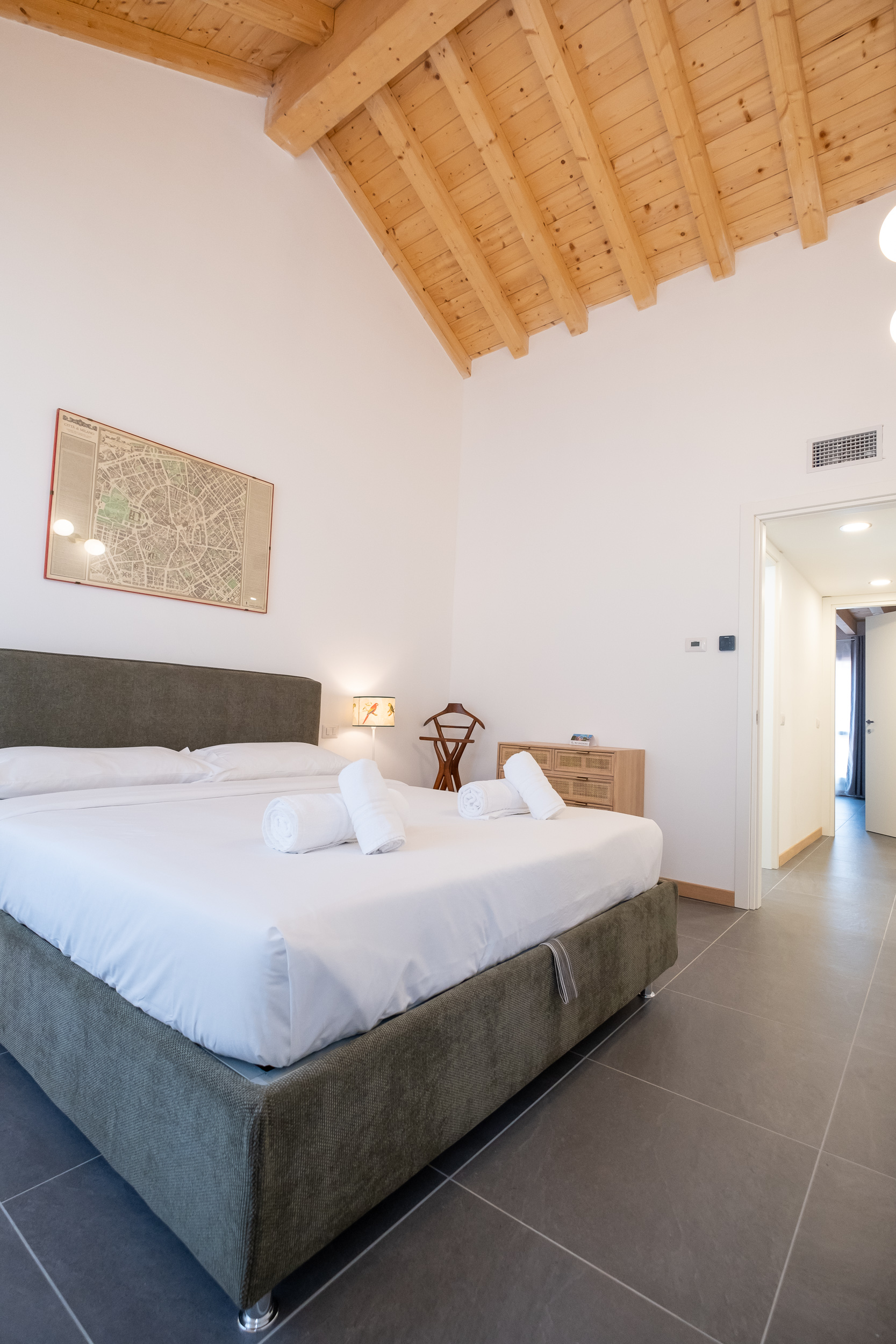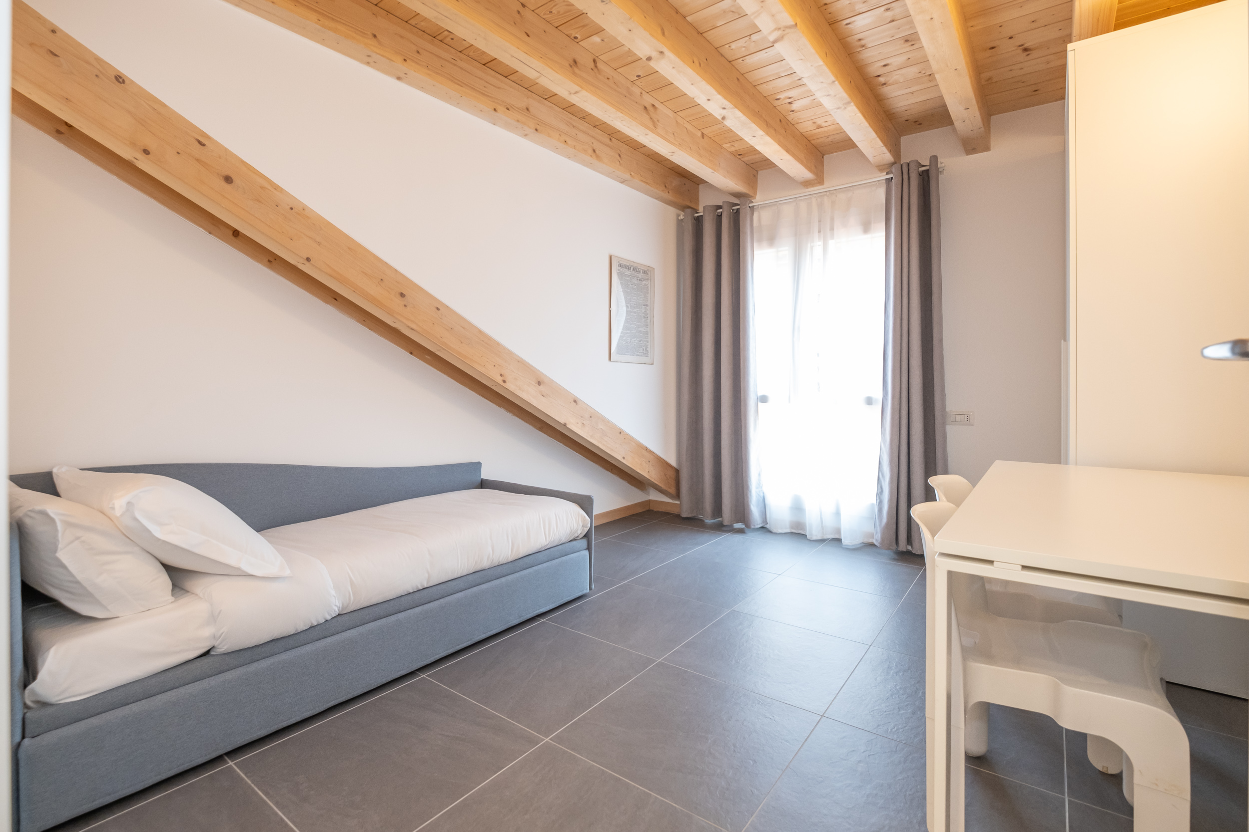 Una camera matrimoniale con bagno privato con doccia, un’altra camera con letto singolo che diventa matrimoniale ed una scrivani e fuori nel corridoio un bagno anch’esso con doccia.