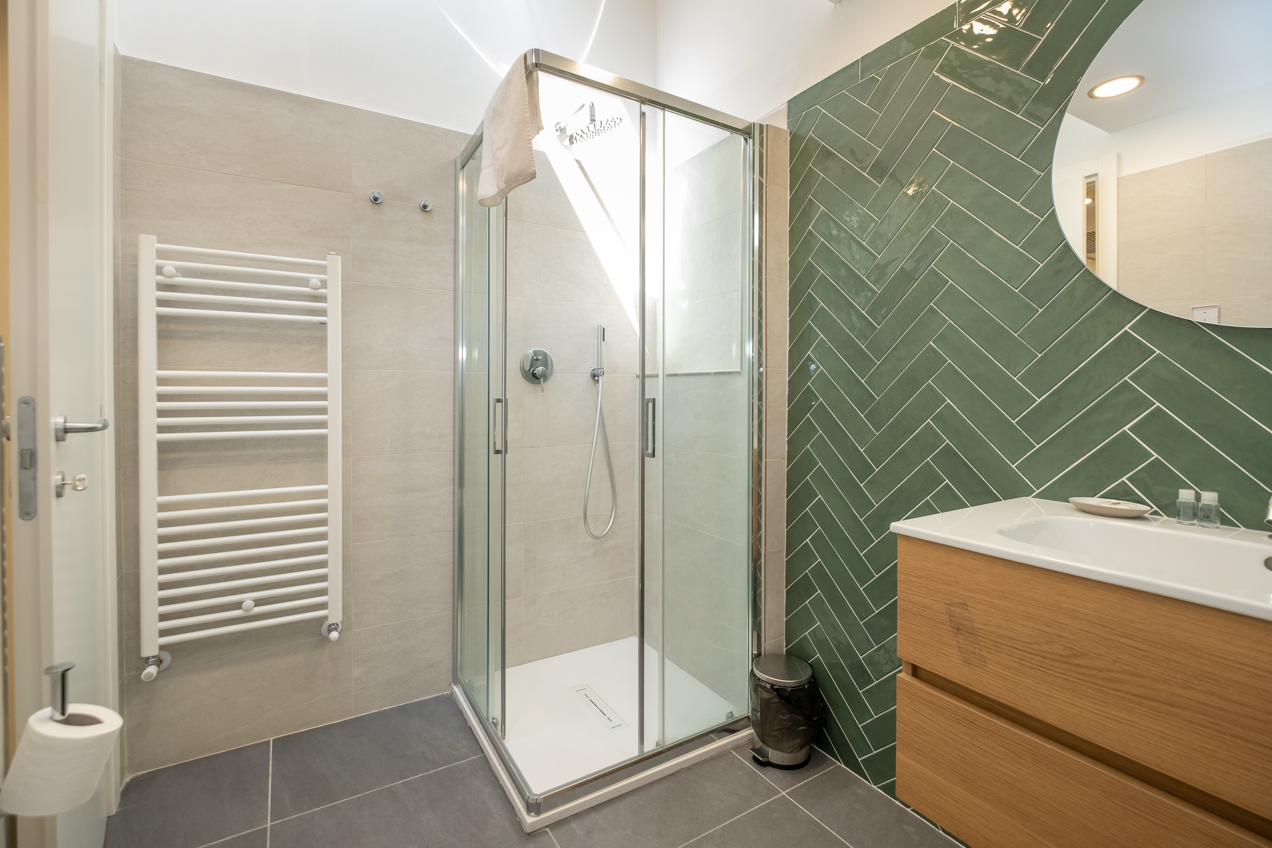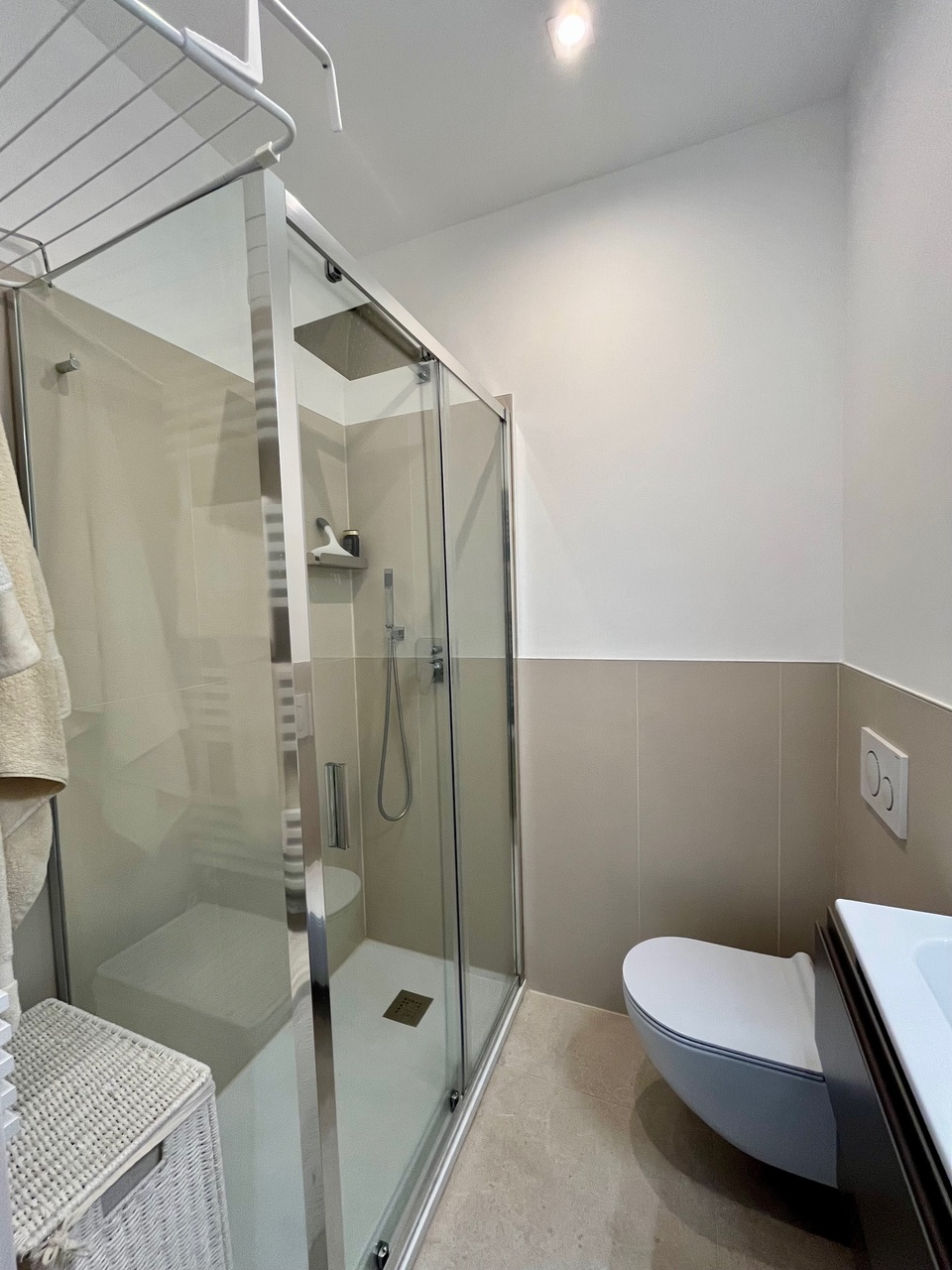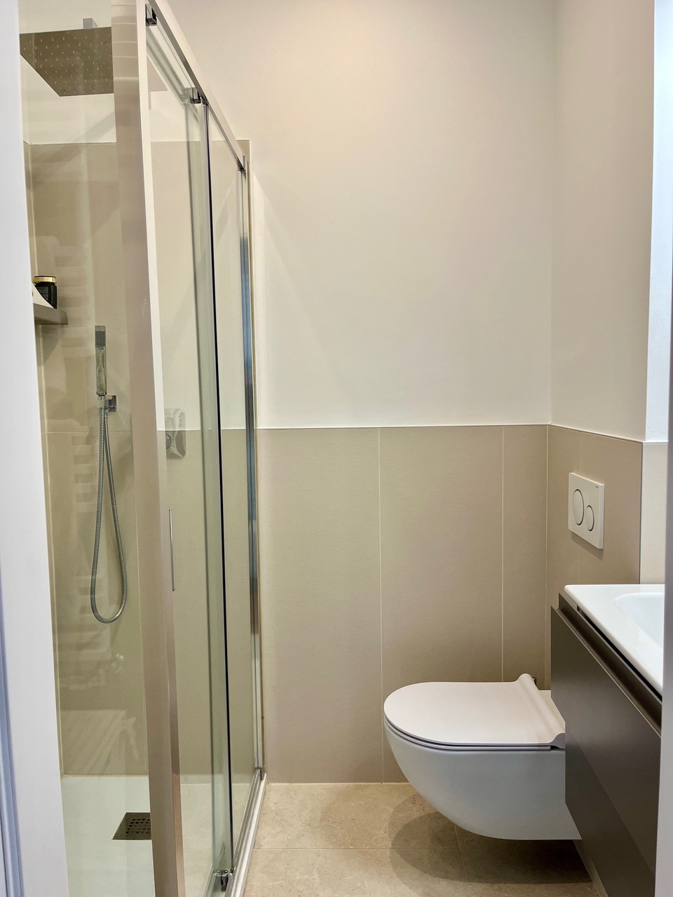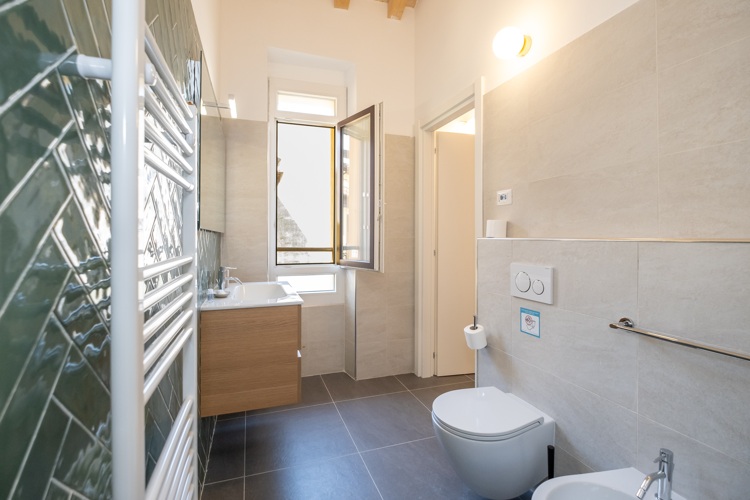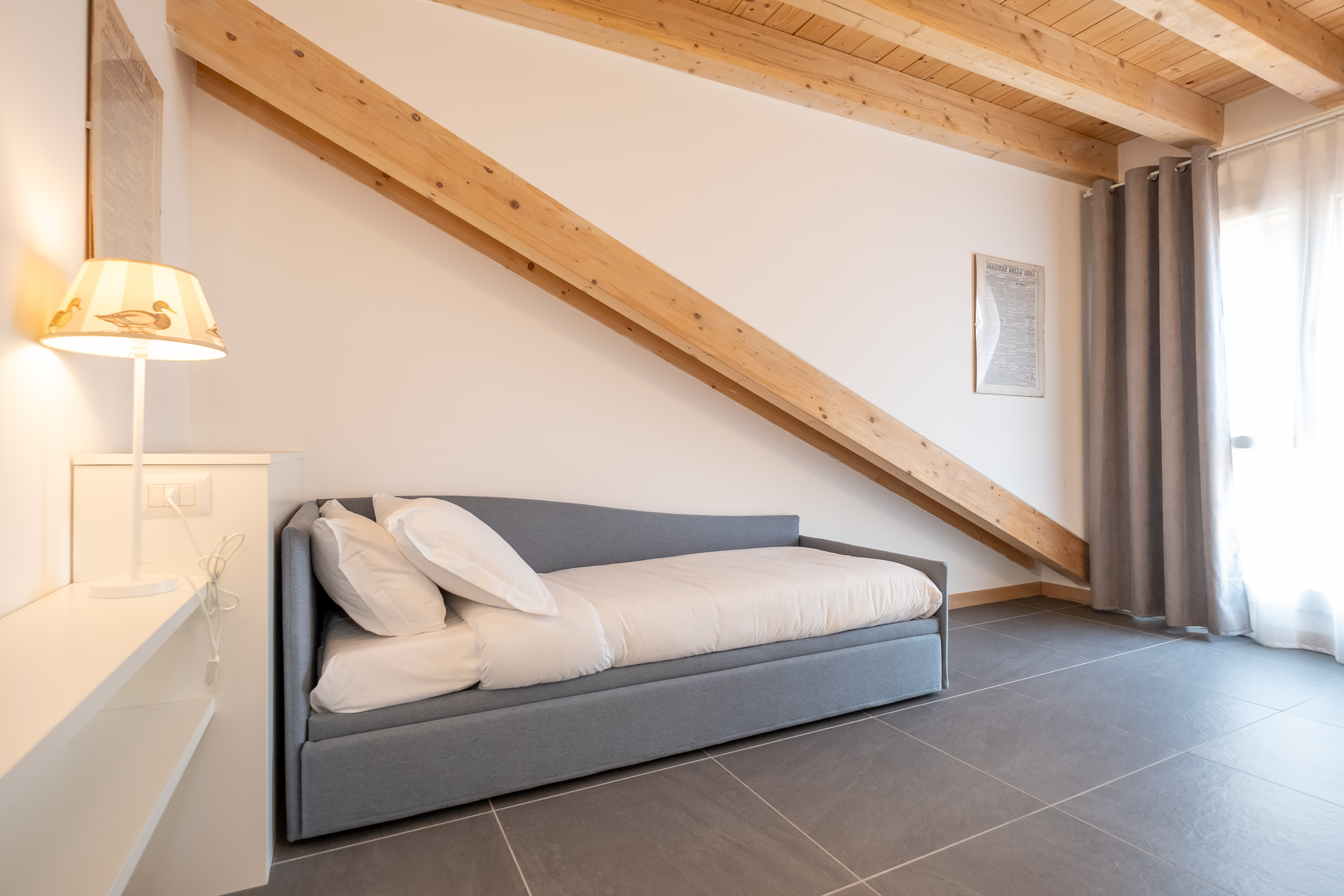 Una camera matrimoniale con bagno privato con doccia, un’altra camera con letto singolo che diventa matrimoniale ed una scrivani e fuori nel corridoio un bagno anch’esso con doccia.
