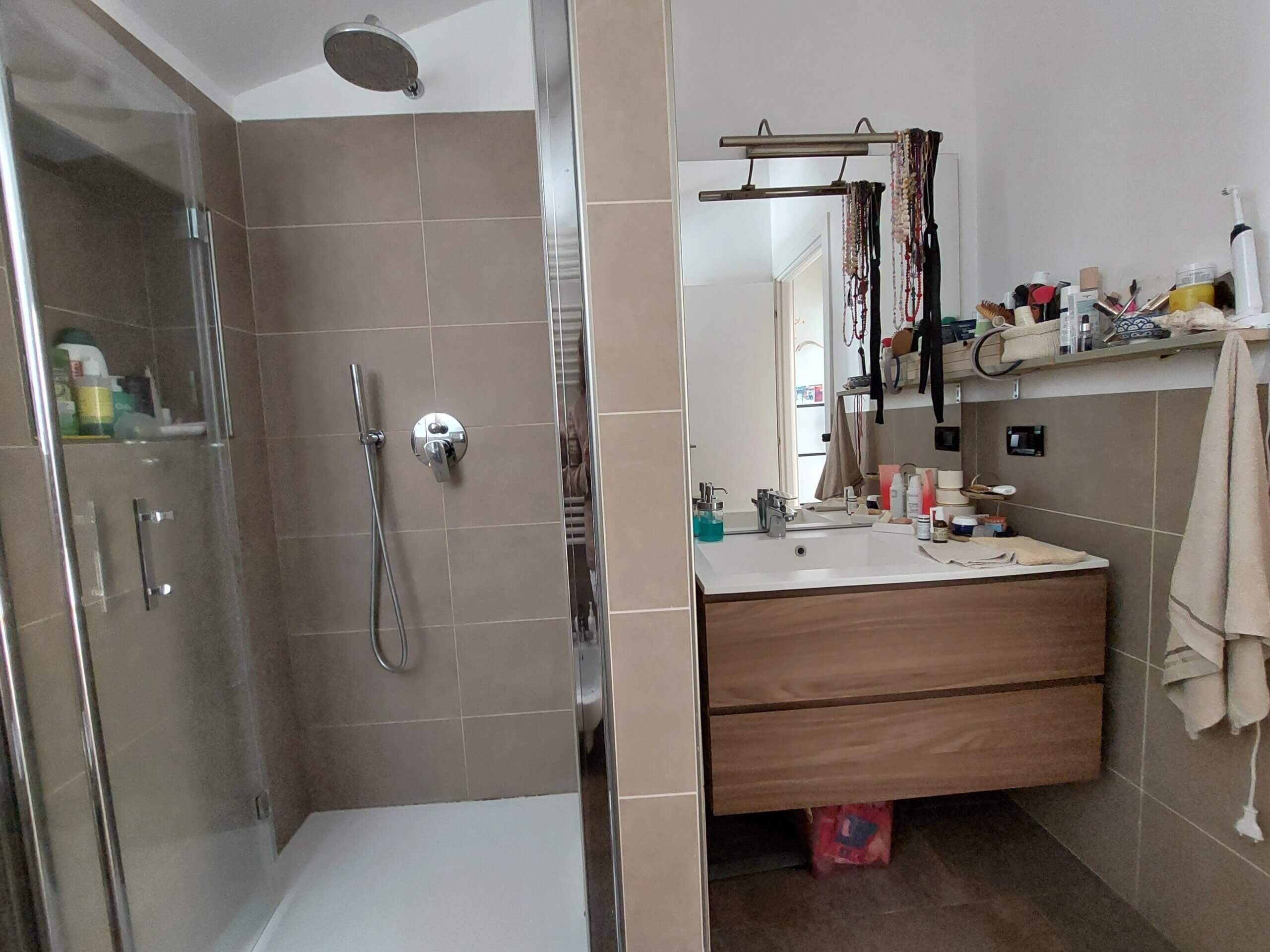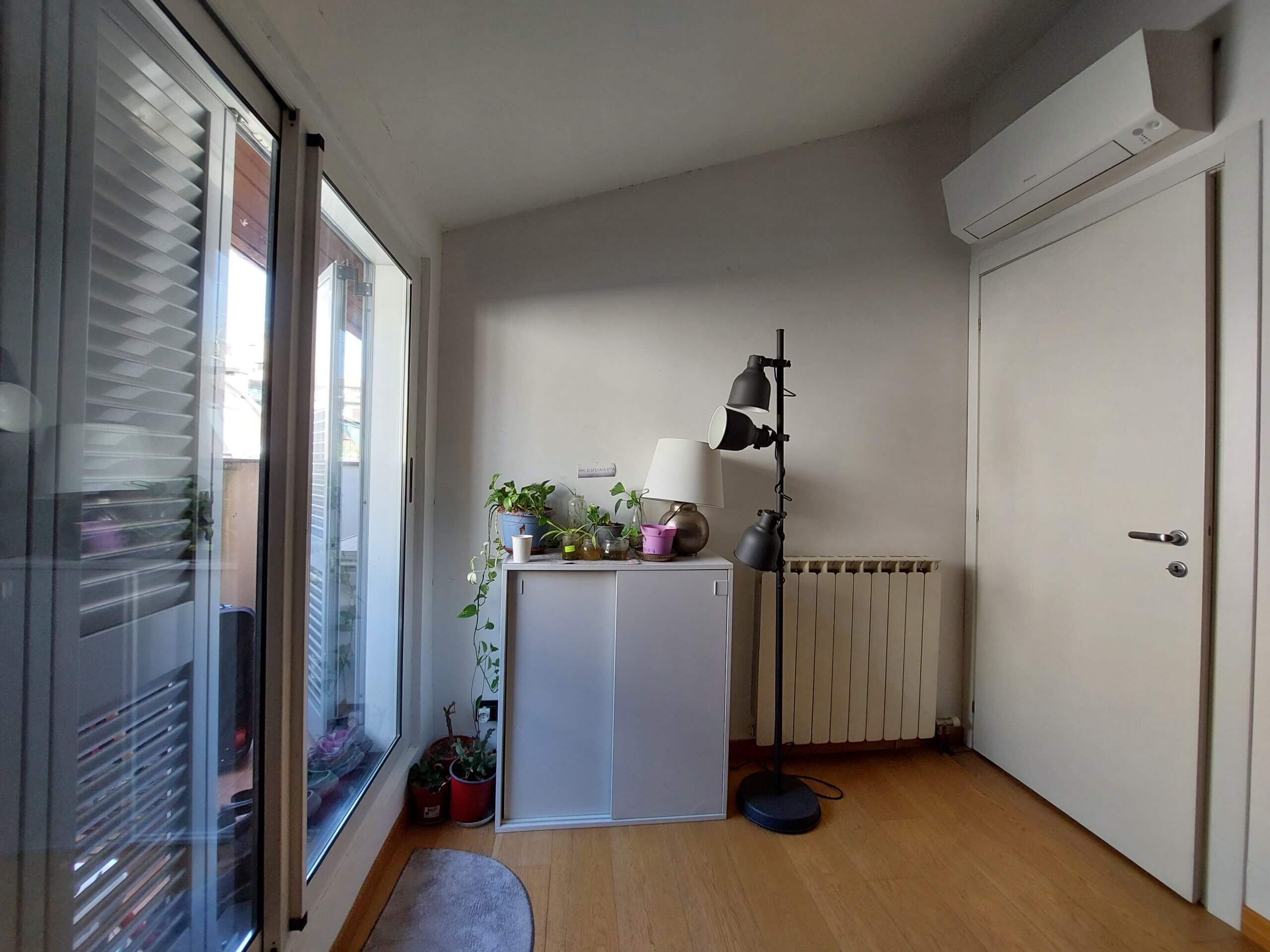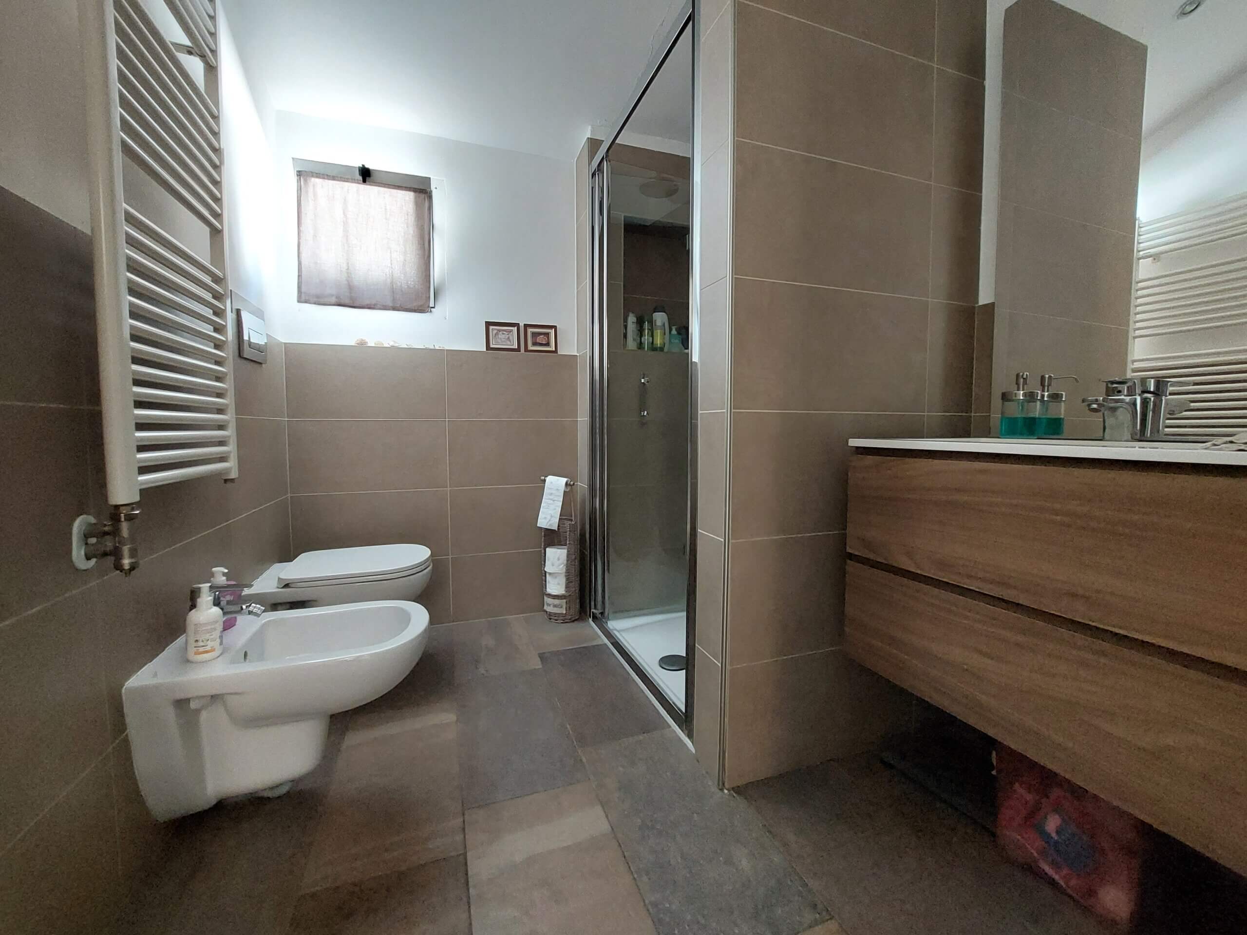 scompartimenti. Vi sono poi due camere di cui una matrimoniale e l’altra utilizzabile come studiolo o seconda camera. Vi è infine un bagno con box doccia e nuovissimi sanitari. Vi è poi un vano contenente la lavatrice. L’appartamento viene consegnato con set cucina, set biancheria. L’appartamento è inoltre dotato di aria condizionata e riscaldamento autonomo.