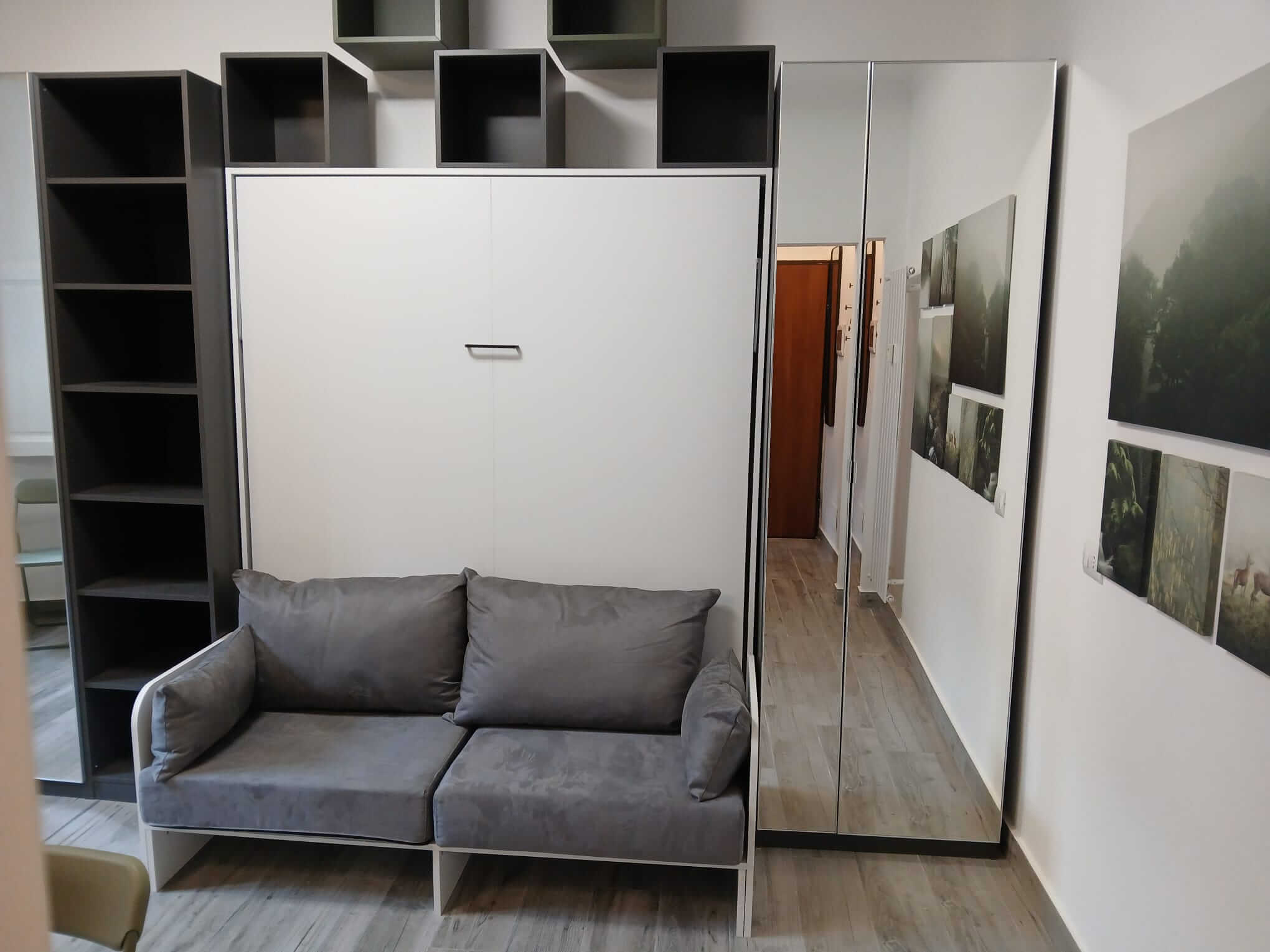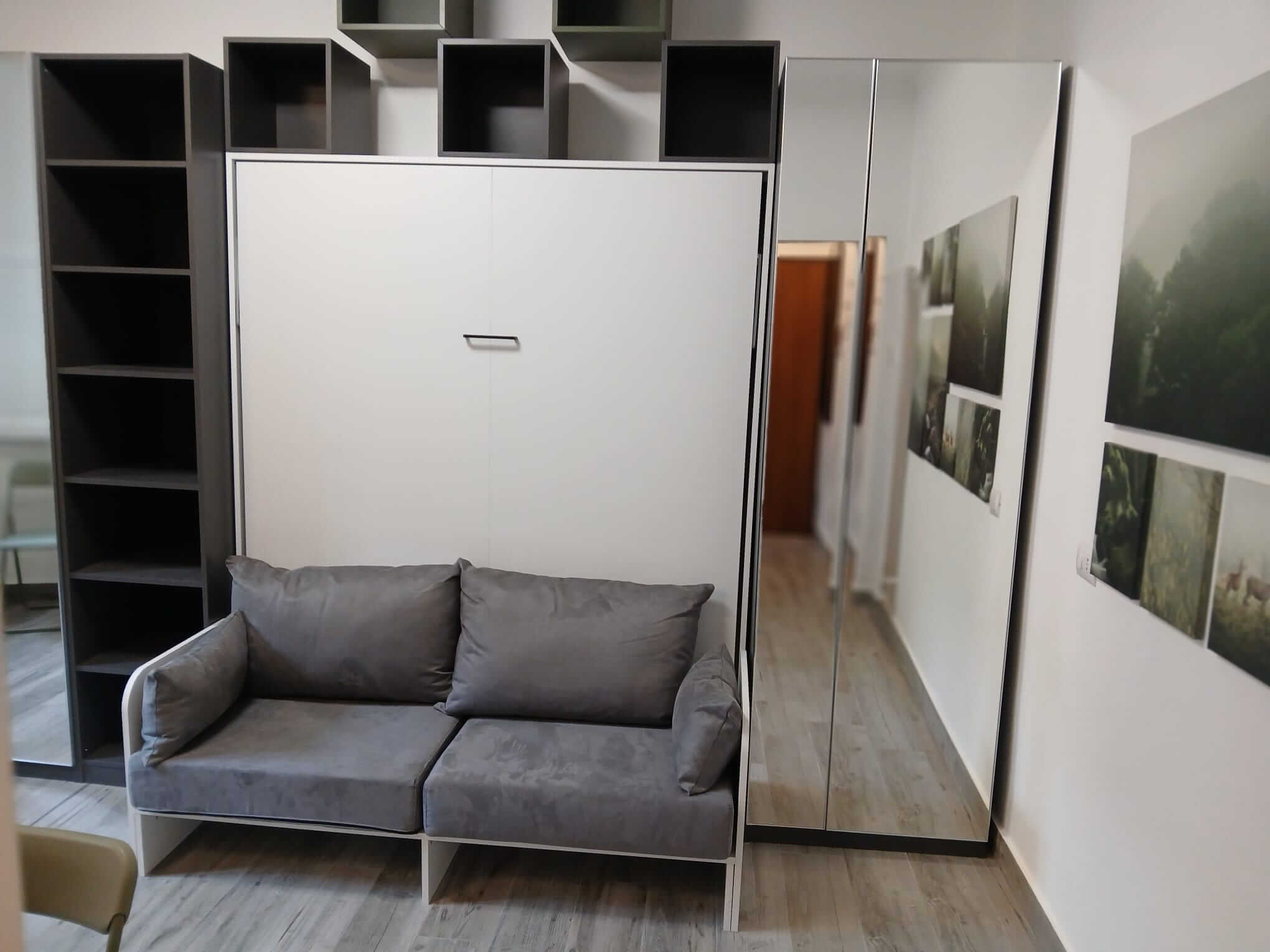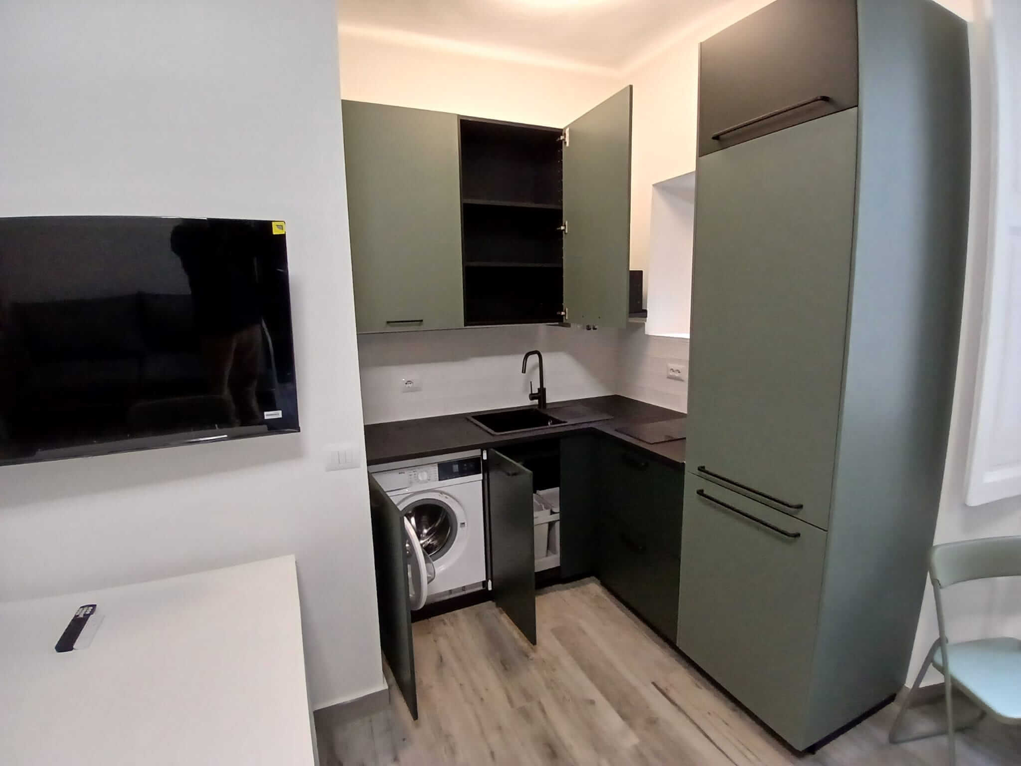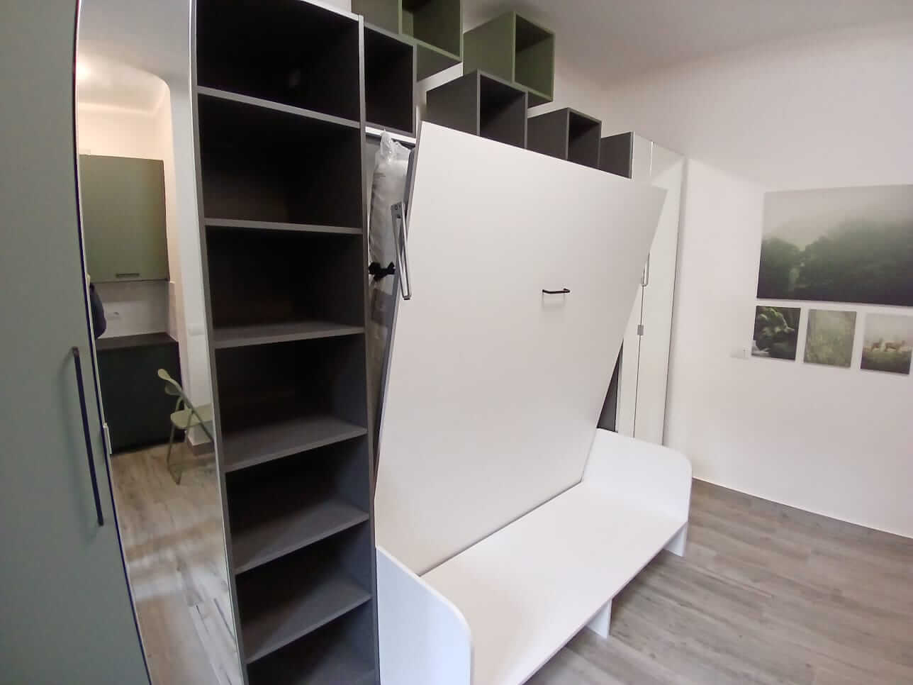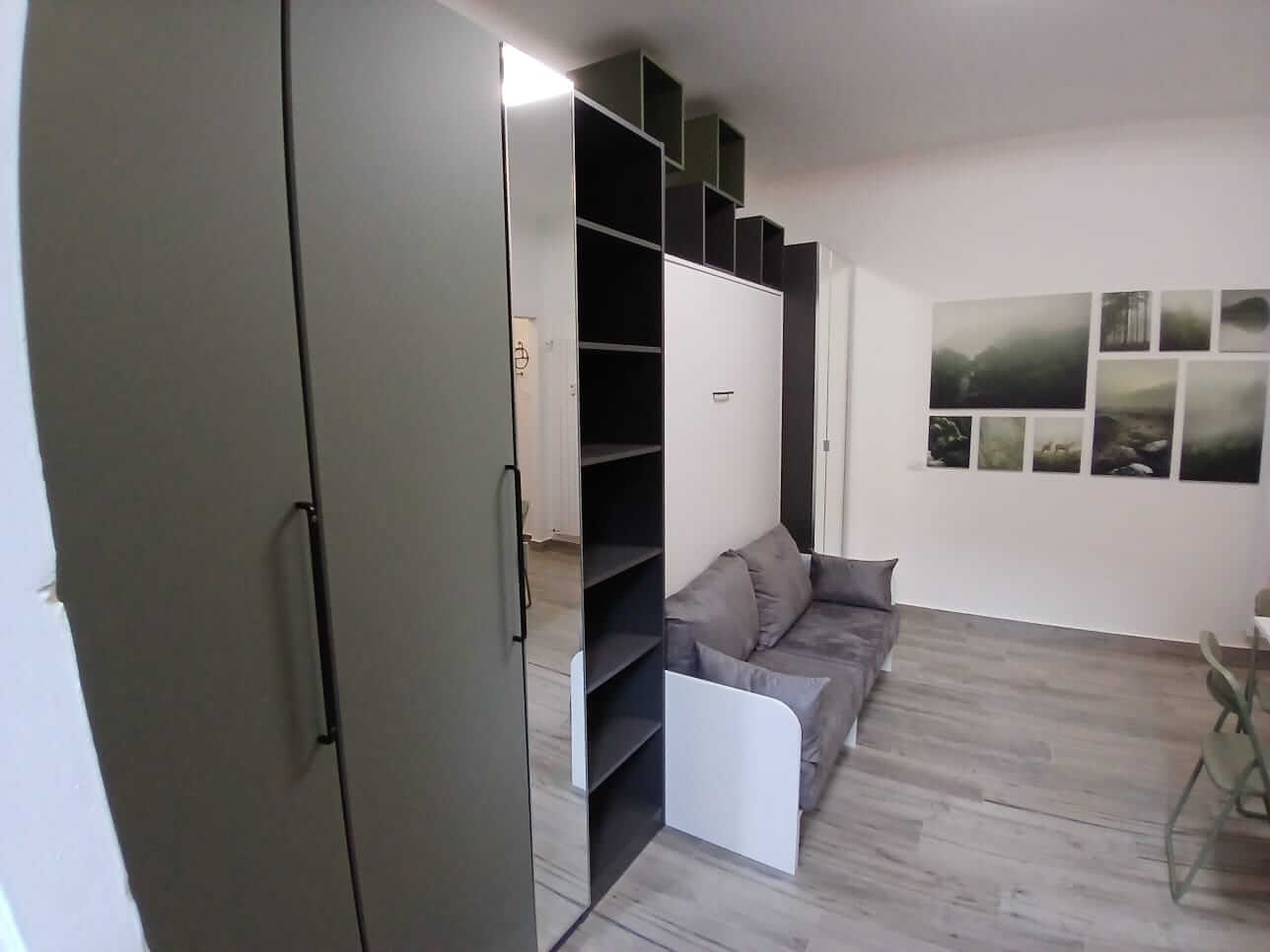 Uno spazio aperto che combina zona giorno, zona notte e cucina, tutto moderno e ben organizzato, e un bagno moderno con doccia.